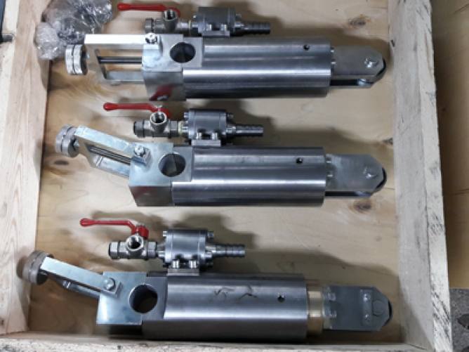 Привод насоса осуществляется пневмоцилиндром который позволяе плавно регулировать скорость дозирования и объем теста. Всасывание теста в насос и слив излишней порции теста происходит через гибкие шланги, опущенные в бачок с тестом.
