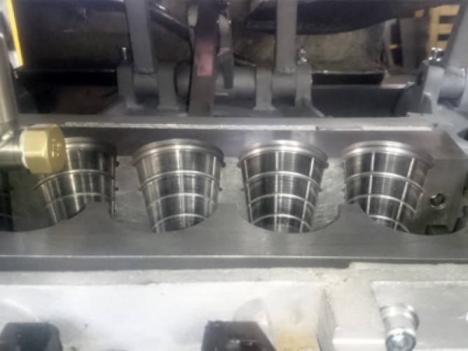 Для выталкивания готовых выпеченных стаканчиков из формы-матрицы в том месте, где происходит раскрытие формы, установлен механизм съема. В момент движения кареток с полуформами параллельно им движется устройство выталкивателями, расположенными напротив каждого из пяти гнезд закрытой формы. Управление движением выталкивателя осуществляется установленными неподвижно копирами.